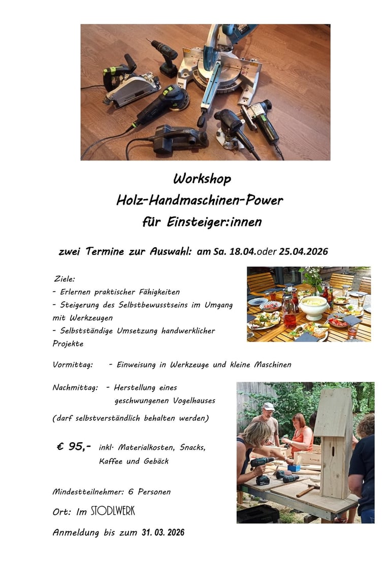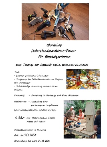 Das Stodlwerk vereint Kunst und Handwerk. In unserem Atelier bieten wir inspirierende Kurse und einzigartige Holzobjekte an. Mieten Sie unseren großzügigen Raum für Ihre eigene Kurse/Workshops und erleben Sie Kreativität pur.