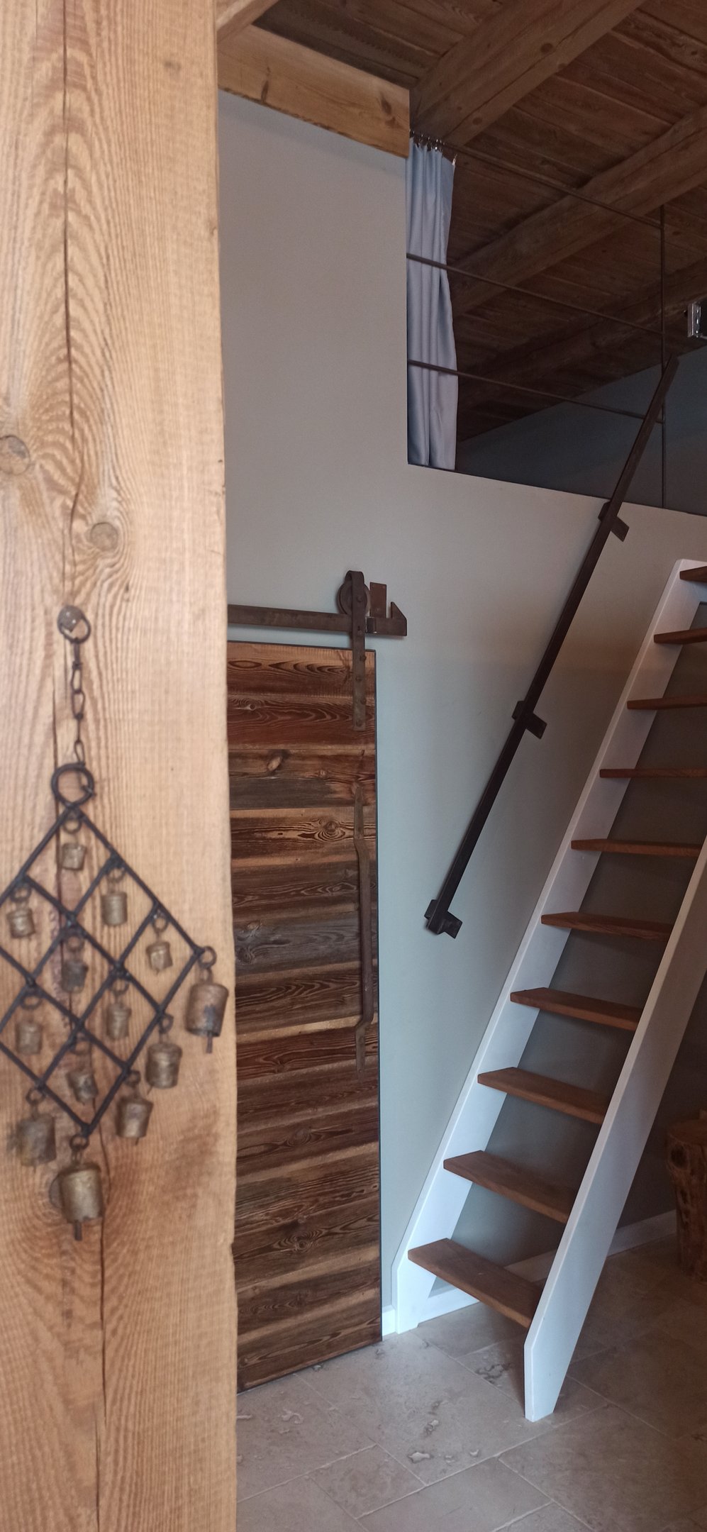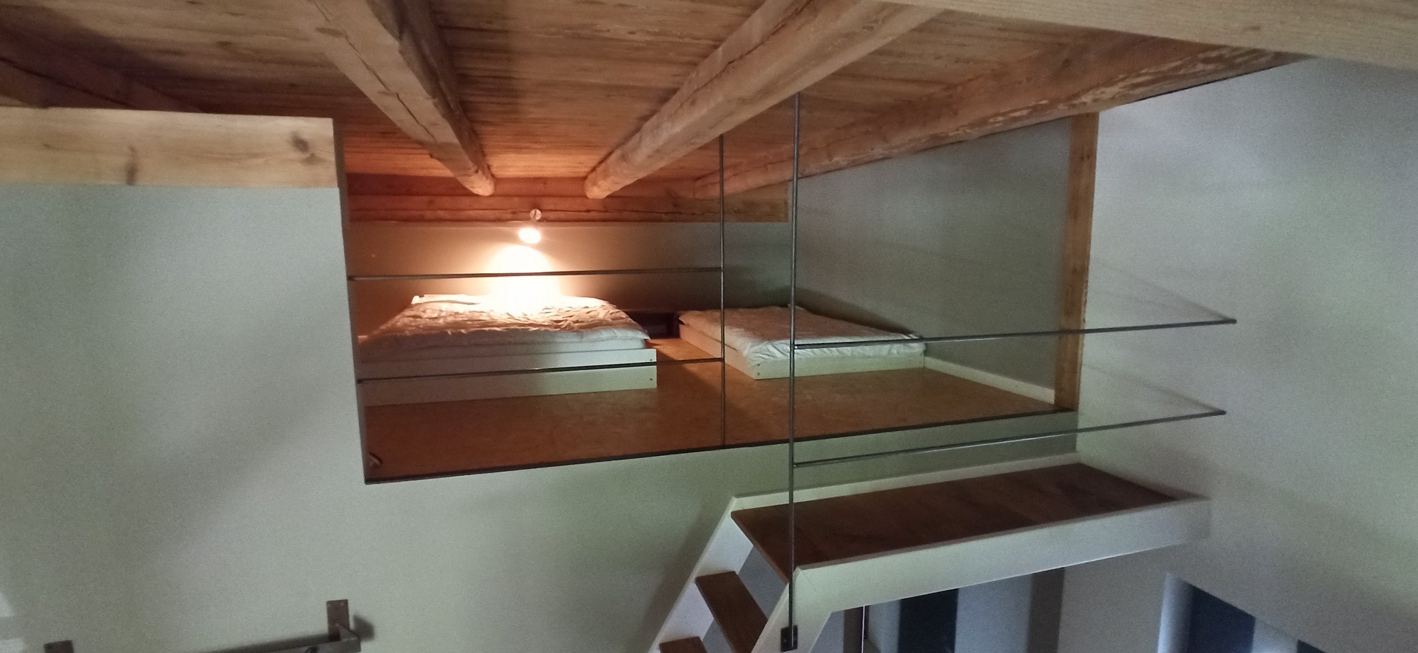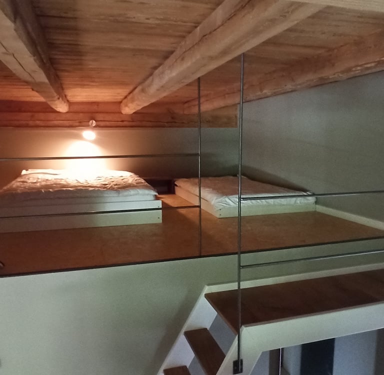 Galerie (Betten für 3 Personen) im oberen Geschoss, Deckenhöhe nur 1,40m; Doppelbett 1,40 m x 2,0 m sowie Einzelbett 0,90 m x 2,0 m.